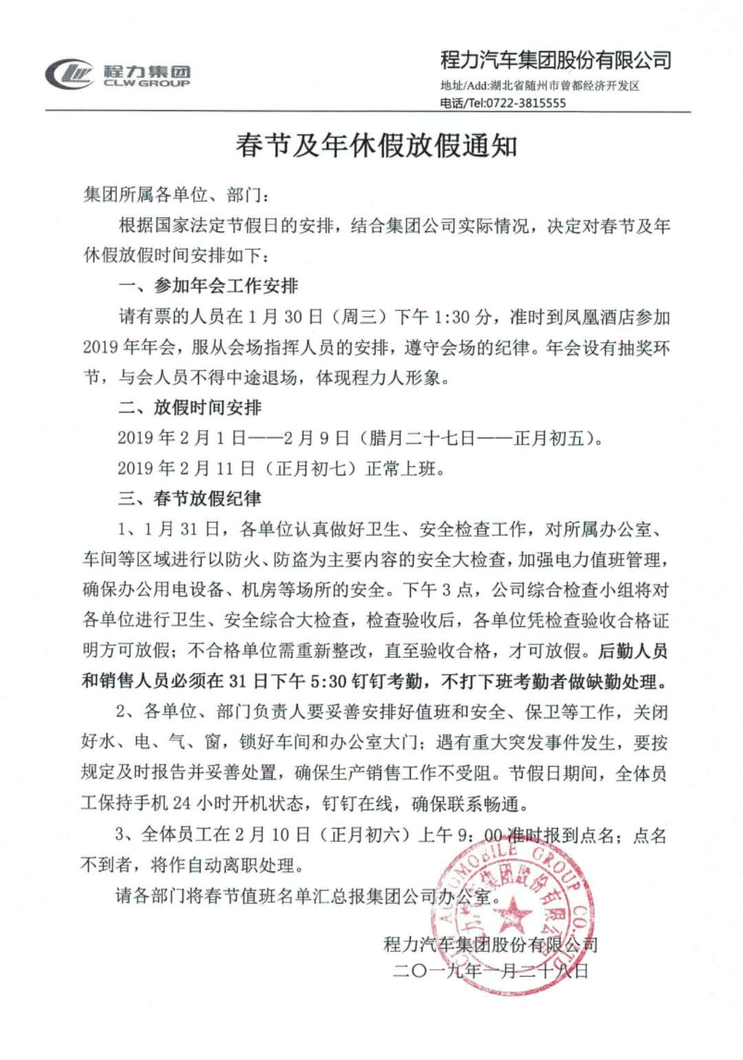 湖北程力集團2019春節放假通知