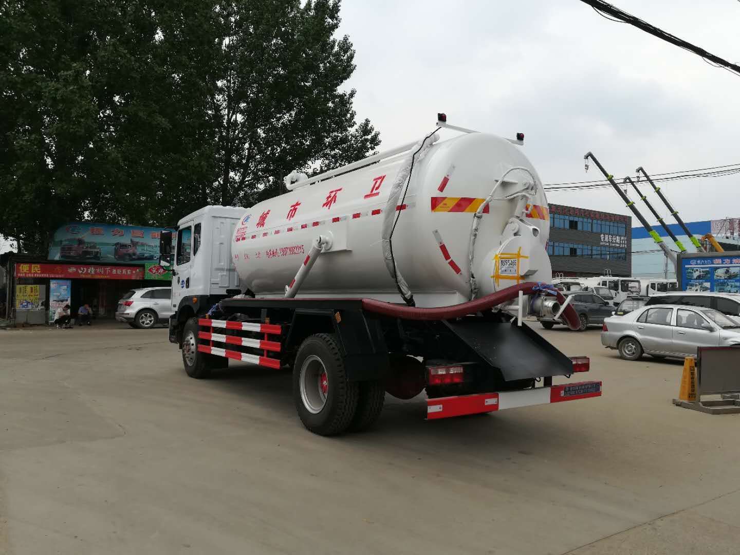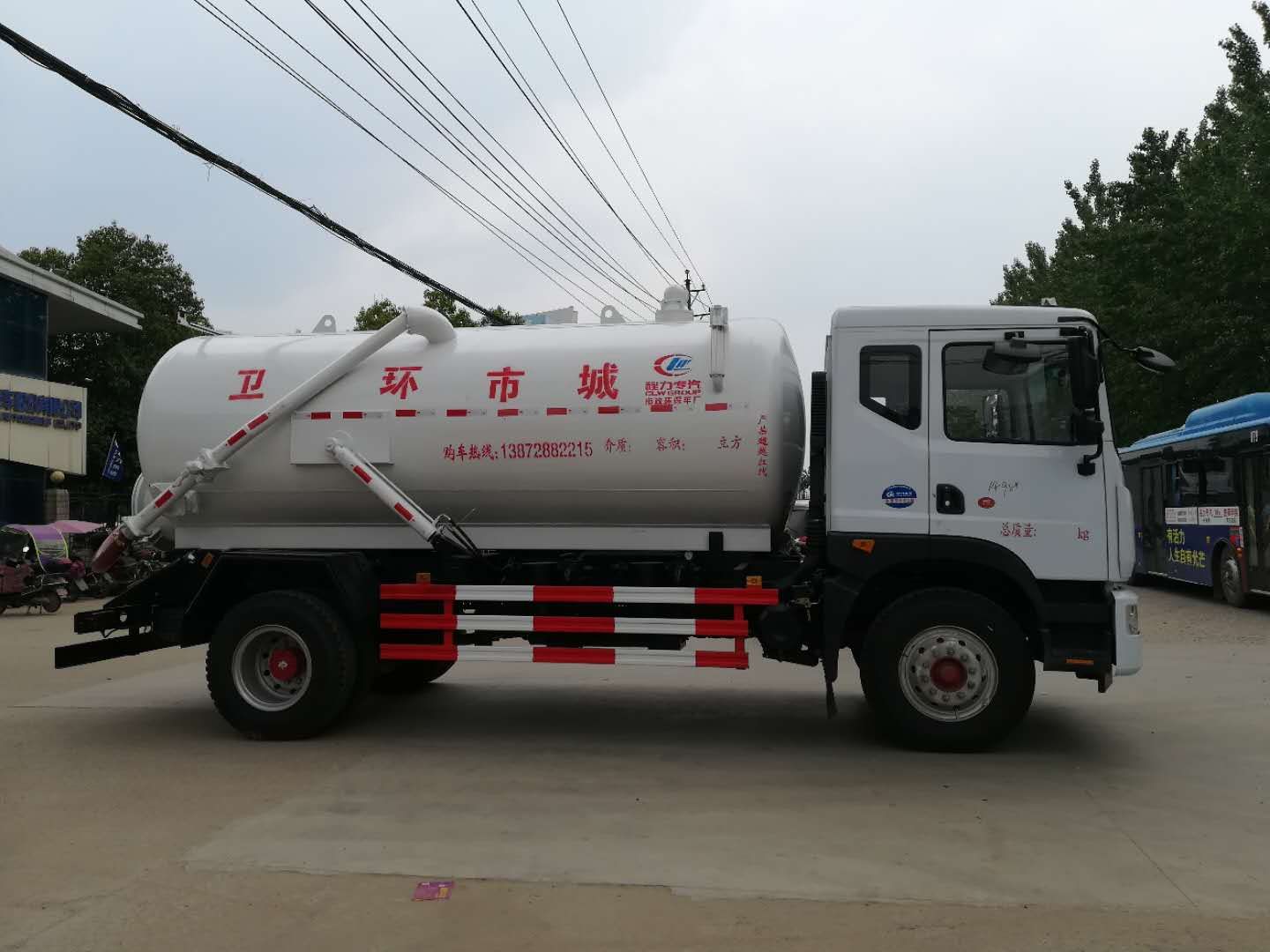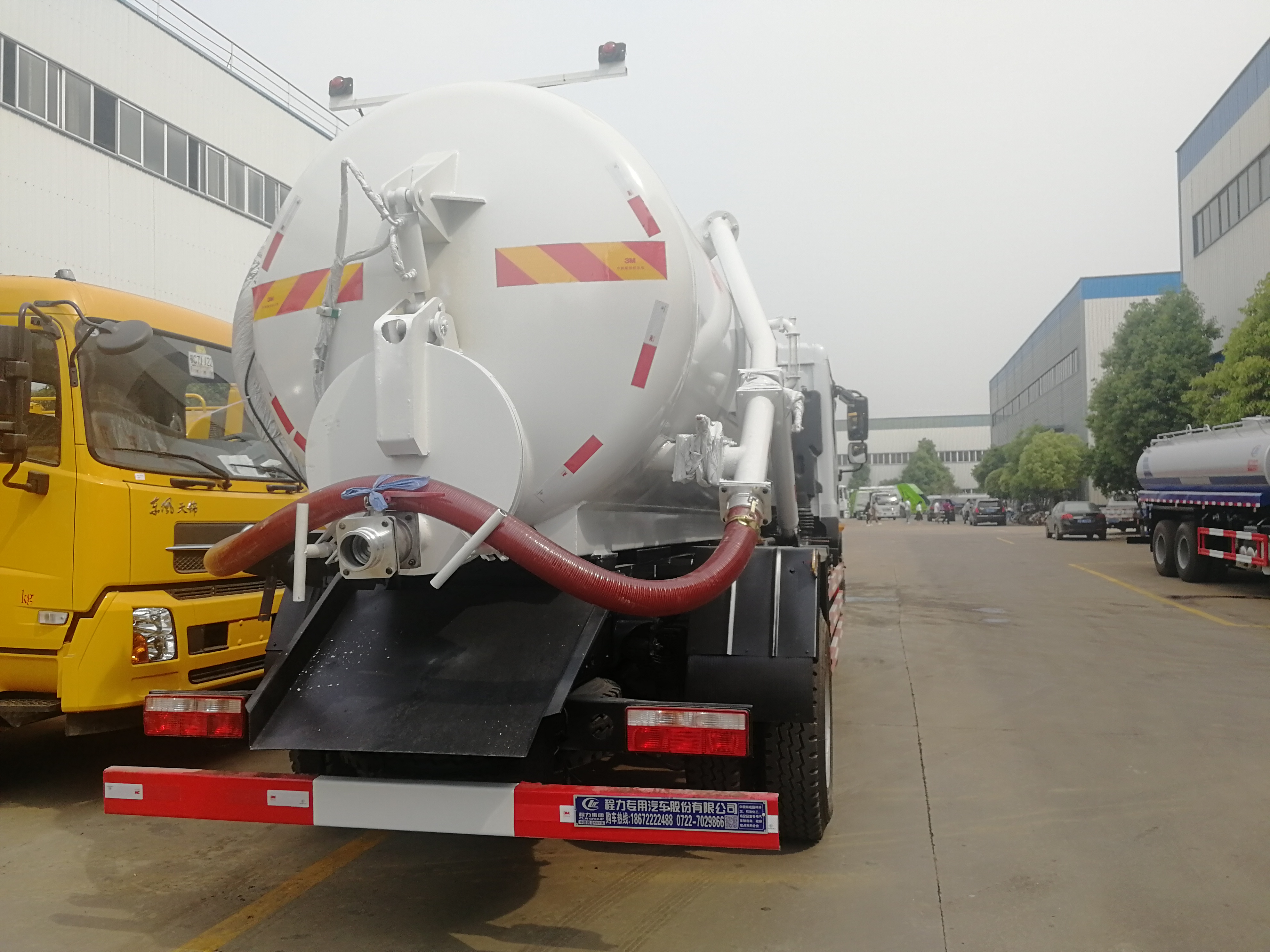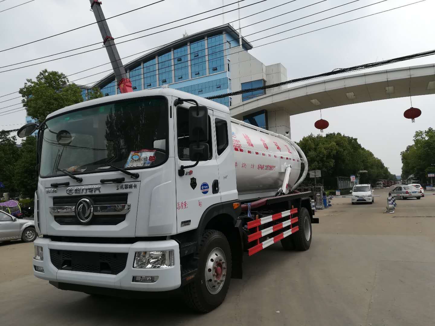 風D9吸污車罐體形狀為圓柱形,采用武鋼6mm厚優質碳鋼鋼板,罐體前部帶吸污窗,洗手裝置,舉升裝置,吸污管8米一根,罐體多種顏色選擇,其余按廠內標準配置制作。隨車配置大功率真空吸污泵和優質液壓系統,罐體封頭一次壓鑄成型、罐體可后開、雙頂自卸。罐內污物可通過后蓋直接傾倒,具有真空度高(比吸糞車的吸力更大)、噸位大、效率高、用途更廣泛的特點。(垂直吸程:≥8 m,工作壓力:8500Pa,理論抽速:120L/S,軸功功率:≤13kw,進排氣口徑:50mm抽滿罐時間<5 min,排滿罐時間<4min。吸污車采用大功率真空泵,一次壓鑄成型的封頭-,加厚的抗壓罐體,雙頂液壓系統,是比吸糞車功能更強大的車型。下面是山東濰坊用戶再次到湖北程力訂購12方吸污車發車圖片: