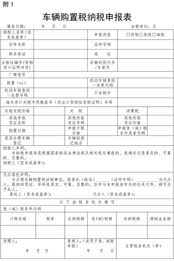 《車輛購置稅納稅申報表》填表說明 1.本表由車輛購置稅納稅人在辦理納(免、減)稅申報時填寫(打印),由納稅人簽章確認。 2.“納稅人名稱”欄,填寫辦理申報時提供的納稅人證件上注明的名稱。 3.“證件名稱”欄,單位納稅人填寫《統一社會信用代碼證書》或者《營業執照》或者其他有效機構證明;個人納稅人填寫《居民身份證》或者其他身份證明名稱。 4.“證件號碼”欄,填寫“證件名稱”欄填寫的證件的號碼。 5.“合格證編號(貨物進口證明書號)”“車輛識別代號/車架號”“廠牌型號”“排量(cc)”欄,分別按照車輛合格證或者《中華人民共和國海關貨物進口證明書》或者《中華人民共和國海關監管車輛進(出)境領(銷)牌照通知書》或者《沒收走私汽車、摩托車證明書》中對應的編號、車輛識別代號/車架號、車輛品牌和車輛型號、排量填寫。 6.“機動車銷售統一發票代碼”“機動車銷售統一發票號碼”“不含稅價”欄,分別按照機動車銷售統一發票相應項目填寫。 7.下列欄次由進口自用車輛的納稅人填寫: 。1)“海關進口關稅專用繳款書(進出口貨物征免稅證明)號碼”欄,填寫《海關進口關稅專用繳款書》中注明的號碼;免征關稅應稅車輛填寫《進出口貨物征免稅證明》中注明的編號。 (2)“關稅完稅價格”欄,通過《海關進口關稅專用繳款書》《海關進口消費稅專用繳款書》《海關進口增值稅專用繳款書》或者其他資料進行采集,順序如下: 、佟逗jP進口關稅專用繳款書》中注明的關稅完稅價格; ② 在免關稅的情況下,通過《海關進口消費稅專用繳款書》中注明的完稅價格和消費稅稅額計算關稅完稅價格; 、 在免關稅和免或者不征消費稅的情況下,采用《海關進口增值稅專用繳款書》中注明的完稅價格; ④ 在關稅、消費稅和增值稅均免征或者不征的情況下,通過其他資料采集關稅完稅價格。 。3)“關稅”欄,填寫《海關進口關稅專用繳款書》中注明的關稅稅額。 (4)“消費稅”欄,填寫《海關進口消費稅專用繳款書》中注明的消費稅稅額。 8.“其它有效憑證名稱”“其它有效憑證號碼”“其它有效憑證價格”欄由未取得機動車銷售統一發票且非進口自用的納稅人按取得的相應證明資料內容填寫。 9.“購置日期”欄,填寫機動車銷售統一發票或者海關進口關稅專用繳款書(進出口貨物征免稅證明)或者其他有效憑證的開具或者生效日期。 10.“申報計稅價格”欄,分別按照下列要求填寫: 。1)境內購置車輛,按照車輛相關憑證的不含稅價填寫; 。2)進口自用車輛,按計稅價格填寫,計稅價格=關稅完稅價格+關稅+消費稅; 11.“申報免(減)稅條件或者代碼”欄,分別按照下列情形填寫文字或者代碼: A.外國駐華使館、領事館和國際組織駐華機構及其有關人員自用的車輛,免稅; B.中國人民解放軍和中國人民武裝警察部隊列入裝備訂貨計劃的車輛,免稅; C.懸掛應急救援專用號牌的國家綜合性消防救援車輛,免稅; D.設有固定裝置的非運輸專用作業車輛,免稅; E.城市公交企業購置的公共汽電車輛,免稅; F.國務院規定予以免稅或者減稅的其他情形的,按照規定免稅或者減稅。 12.“是否辦理車輛登記”欄,如填寫“是”,則“車輛擬登記地點”欄應填寫具體縣(市、區)。 13.本表一式二份(一車一表),一份由納稅人留存,一份由主管稅務機關留存。