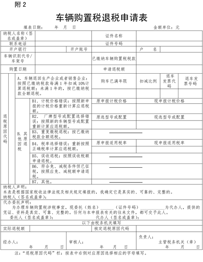 《車輛購置稅退稅申請表》填表說明 1.本表由車輛購置稅納稅人在辦理退稅申請時填寫(打印),由納稅人簽章確認。 2.“納稅人名稱”欄,填寫辦理退稅申報時提供的納稅人證件上注明的名稱。 3.“證件名稱”欄,單位納稅人填寫《統一社會信用代碼證書》或者《營業執照》或者其他有效機構證明;個人納稅人填寫《居民身份證》或者其他身份證明名稱。 4.“證件號碼”欄,填寫“證件名稱”欄填寫的證件的號碼。 5.“開戶銀行”“賬號”“戶名”欄,填寫納稅人用來接收國庫退稅稅款的開戶銀行、賬號及開戶名稱。 6.“車輛識別代號/車架號”欄,按車輛合格證或者《中華人民共和國海關貨物進口證明書》或者《中華人民共和國海關監管車輛進(出)境領(銷)牌照通知書》或者《沒收走私汽車、摩托車證明書》中對應的車輛識別代號(車架號)填寫。 7.“已繳納車輛購置稅稅款”欄,填寫主管稅務機關開具的車輛購置稅繳稅憑證上注明的繳稅金額。 8.“購置日期”欄,填寫機動車銷售統一發票(或者有效憑證)上注明的開票日期。 9.“申請退稅額”欄,填寫納稅人向稅務機關申請的退稅金額。 10.“退稅原因代碼”欄,按表中右側對應原因選擇相應的字母填寫。 11.本表(一車一表)一式三份,一份由納稅人留存;一份由國庫留存;一份由主管稅務機關留存。