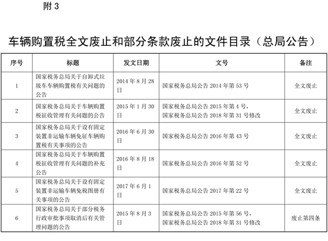 為落實《中華人民共和國車輛購置稅法》(以下簡稱《車購稅法》),規范車輛購置稅征收管理,現就有關事項公告如下: 一、車輛購置稅實行一車一申報制度。 二、《車購稅法》第六條第四項所稱的購置應稅車輛時相關憑證,是指原車輛所有人購置或者以其他方式取得應稅車輛時載明價格的憑證。無法提供相關憑證的,參照同類應稅車輛市場平均交易價格確定其計稅價格。無同類應稅車輛市場平均交易價格的,由稅務機關依據《中華人民共和國稅收征收管理法》(以下簡稱《稅收征管法》)及其實施細則核定其應納稅額。 原車輛所有人為車輛生產或者銷售企業,未開具機動車銷售統一發票的,按照車輛生產或者銷售同類應稅車輛的銷售價格確定應稅車輛的計稅價格。無同類應稅車輛銷售價格以及同類應稅車輛無銷售價格的,按照組成計稅價格確定應稅車輛的計稅價格。 三、購置應稅車輛的納稅人,應當到下列地點申報納稅: 。ㄒ唬┬枰k理車輛登記的,向車輛登記地的主管稅務機關申報納稅; (二)不需要辦理車輛登記的,單位納稅人向其機構所在地主管稅務機關申報納稅,個人納稅人向其戶籍所在地或者經常居住地的主管稅務機關申報納稅。 四、《車購稅法》第十二條所稱納稅義務發生時間,按照下列情形確定: (一)購買自用應稅車輛的為購買之日,即車輛相關價格憑證的開具日期; 。ǘ┻M口自用應稅車輛的為進口之日,即《海關進口增值稅專用繳款書》或者其他有效憑證的開具日期; 。ㄈ┳援a、受贈、獲獎或者以其他方式取得并自用應稅車輛的為取得之日,即合同、法律文書或者其他有效憑證的生效或者開具日期。 五、納稅人辦理納稅申報時應當如實填報《車輛購置稅納稅申報表》(附件一,以下簡稱《納稅申報表》),同時提供車輛合格證明和車輛相關價格憑證。 六、納稅人在辦理車輛購置稅免稅、減稅時,除按本公告第五條規定提供資料外,還應當根據不同的免減稅項目,分別提供以下資料的原件或者復印件: 。ㄒ唬┩鈬v華使館、領事館和國際組織駐華機構及其有關人員自用車輛,提供機構證明和外交部門出具的身份證明。 (二)城市公交企業購置的公共汽電車輛,提供所在地縣級以上(含縣級)交通運輸主管部門出具的公共汽電車輛認定表。 。ㄈ⿷覓鞈本仍畬S锰柵频膰揖C合性消防救援車輛,提供中華人民共和國應急管理部批準的相關文件。 。ㄋ模┗貒⻊盏脑谕饬魧W人員購買的自用國產小汽車,提供海關核發的《中華人民共和國海關回國人員購買國產汽車準購單》。 。ㄎ澹╅L期來華定居專家進口自用小汽車,提供國家外國專家局或者其授權單位核發的專家證或者A類和B類《外國人工作許可證》。 七、免稅、減稅車輛因轉讓、改變用途等原因不再屬于免稅、減稅范圍的,納稅人在辦理納稅申報時,應當如實填報《納稅申報表》。發生二手車交易行為的,提供二手車銷售統一發票;屬于其他情形的,按照相關規定提供申報材料。 八、已經繳納車輛購置稅的,納稅人向原征收機關申請退稅時,應當如實填報《車輛購置稅退稅申請表》(附件二,以下簡稱《退稅申請表》),除提供納稅人身份證明外,還應當按照下列情況分別提供以下資料: 。ㄒ唬┸囕v退回生產企業或者銷售企業的,提供生產企業或者銷售企業開具的退車證明和退車發票。 。ǘ┢渌罁煞ㄒ幰幎☉斖硕惖,根據具體情形提供相關資料。 九、納稅人應如實申報應稅車輛的計稅價格。 納稅人沒有編造虛假計稅依據的,稅務機關按照其申報的計稅價格征收稅款;納稅人編造虛假計稅依據的,稅務機關依照《稅收征管法》及其實施細則的相關規定處理。 十、稅務機關追繳稅款時,納稅人無法按照規定提供申報資料的,可以依據司法、審計、財政等有關機關的文書,為其辦理補稅手續。 十一、本公告要求納稅人提供的資料,稅務機關能夠通過政府信息共享等手段獲取相關資料信息的,納稅人不再提交。 十二、本公告所稱的納稅人身份證明:單位納稅人為《統一社會信用代碼證書》或者營業執照或者其他有效機構證明,個人納稅人為居民身份證或者居民戶口簿或者入境的身份證件。 本公告所稱車輛合格證明為整車出廠合格證或者車輛電子信息單。 本公告所稱車輛相關價格憑證,境內購置車輛為機動車銷售統一發票或者其他有效憑證,進口自用車輛為《海關進口關稅專用繳款書》或者海關進出口貨物征免稅證明。屬于應征消費稅車輛的還包括《海關進口消費稅專用繳款書》。 十三、稅務機關應當在稅款足額入庫或者辦理免稅手續后,將應稅車輛完稅或者免稅電子信息,及時傳送給公安機關交通管理部門。 上款所指稅款足額入庫的情形包括:納稅人到銀行辦理車輛購置稅稅款繳納(轉賬或者現金)由銀行將稅款繳入國庫的,國庫已傳回《稅收繳款書(銀行經收專用)》聯次;納稅人通過橫向聯網電子繳稅系統等電子方式繳納稅款的,稅款劃繳已成功;納稅人在辦稅服務廳以現金方式繳納稅款的,主管稅務機關已收取稅款。 十四、納稅人名稱、車輛廠牌型號、發動機號、車輛識別號、證件號碼等應稅車輛完稅或者免稅電子信息與原申報資料不一致的,納稅人可以到稅務機關辦理完稅或者免稅電子信息更正,但是不包括以下情形: 。ㄒ唬┸囕v識別代號(車架號)和發動機號同時與原申報資料不一致。 。ǘ┩甓惢