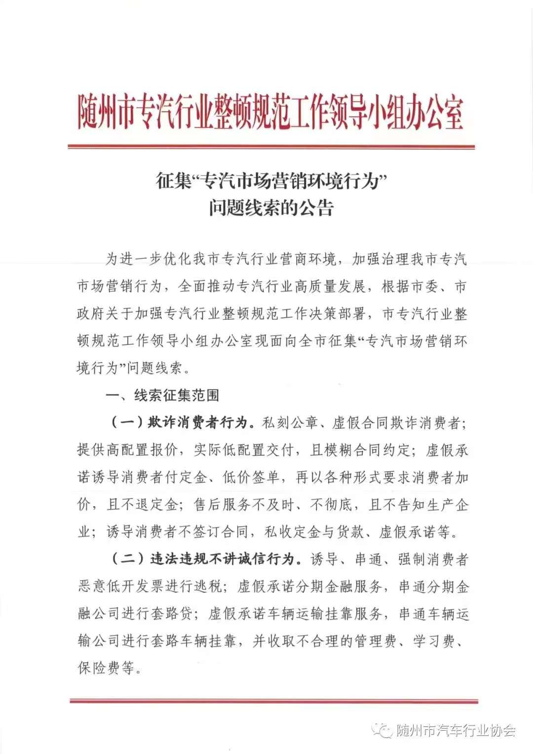 隨州市汽車行業協會關于整頓“隨州專汽市場營銷環境行為”銷售欺詐投訴舉報公告