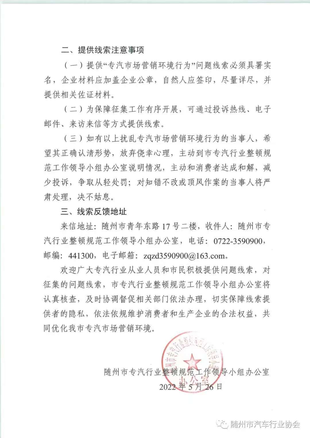 歡迎廣大專汽行業從業人員和市民積極提供問題線索,征集的問題線索,隨州市專汽行業整頓規范工作領導小組辦公室將認真核查,及時協調督促相關部門依法辦理,切實保障線索提供者的隱私,依法依規維護消費者和生產企業的合法權益,共同優化隨州市專汽市場營銷環境。