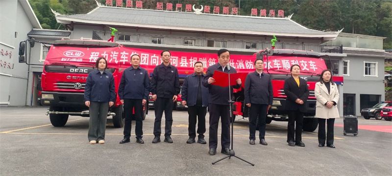 上圖:程力汽車集團董事長程阿羅(前排左)向劍河縣副縣長王平(前排右)舉行象征“致富之匙”的車輛捐贈儀式。 讓我們把時光的鏡頭聚焦在2024年11月23日,全國工商聯執委、程力汽車集團股份有限公司董事長程阿羅與集團黨委書記袁昌才等相關部門負責人,第二次到劍河縣捐贈消防灑水車;程董事長與劍河縣委書記楊勝朝、縣長陳林同志等職能部門領導,在劍河消防隊舉行了“踐行萬企興萬村,程力劍河一家親”第二批消防灑水車捐贈儀式。 上圖:從左至右分別是劍河縣縣長陳林、程力汽車集團董事長程阿羅、劍河縣委書記楊勝朝、程力汽車集團黨委書記袁昌才。
