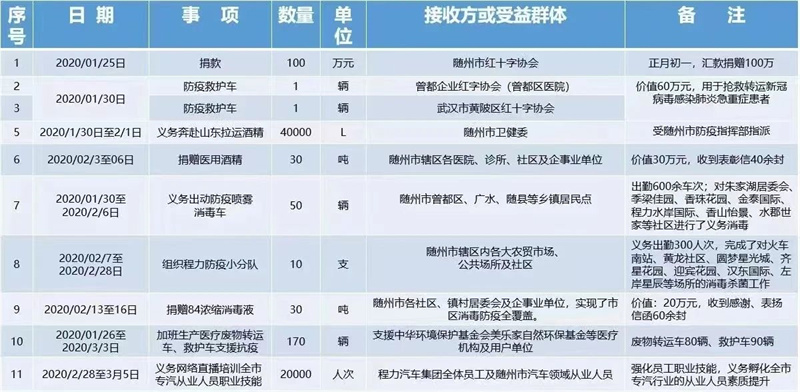 捐贈以后,雙方領導和負責任人集體合影紀念。 “躬行踐履始玉成,行而不輟終致遠”,逆光穿行回望來路,程力汽車集團于2023年,按照全國工商聯的總體部署安排,程力汽車集團幫扶的劍河縣“萬企興萬村”鄉村振興項目,向該縣消防大隊捐贈了第一批5輛中大型消防灑水車,程力汽車集團與劍河縣政府簽署了合作備忘錄,并提供多項幫扶措施。 程力汽車集團自2004年創立以來,就踐行社會責任倡導公益事業,在創建世界一流專汽領先企業的過程中,始終如一的把“精準扶貧”、“抗疫抗洪、搶險救災”、“萬企興萬村”,以及扶危濟困、關愛孤寡老人、殘疾兒童,捐款捐物等公益事業作為回報社會的重要途徑,先后對宣恩縣巴楚風印務公司、恩施移民社區,以及隨州養老院、殘疾孤兒院、萬店鎮新東村扶貧,隨縣柳林鎮洪災、廣水雙塘村鄉村振興,抗疫捐款捐物、河南鄭州洪災、甘肅積石山地震、河北涿州水災、湖南岳陽潰壩搶險,都給予援助救急解困,累計投入數千萬公益資金。 一路走來,程力在公益事業得到了黨委政府的嘉獎表揚,現部分擇錄如下以饗讀者:從“千企幫千村”到“萬企幫萬村”,再到“萬企興萬村”,以及從精準扶貧到扶危濟困,從抗疫到抗洪、地震救援,程力人無一不沖鋒在前沿,堅持不懈的奮斗在公益事業第一線。