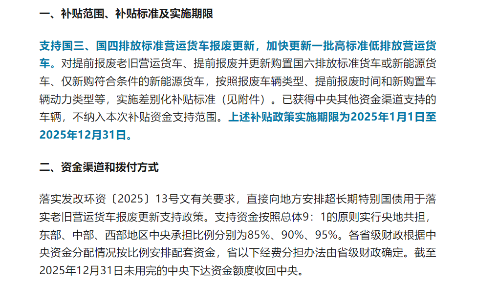 3月14日 深圳啟動以舊換新實施方案 深圳市發展和改革委員會、深圳市財政局關于印發2025年超長期特別國債資金加力擴圍支持消費品以舊換新實施方案的通知 ,明確指出,在2024年政策基礎上,將老舊營運貨車報廢更新補貼范圍擴大至國四排放標準營運貨車。對提前報廢國四及以下排放標準營運柴油貨車,平均每輛補貼3萬元;提前報廢并新購國六排放標準貨車或新能源貨車,平均每輛補貼8萬元;僅新購新能源城市冷鏈配送貨車,每輛補貼3.5萬元。
