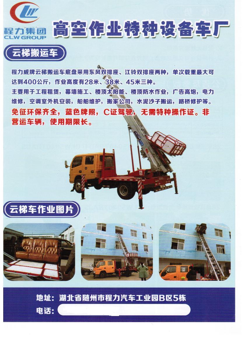 湖北程力程力威牌云梯搬家車作業高度可達28米,云梯從韓國進口,底盤有東風雙排座和慶鈴鈴雙排座兩種可選擇。 |