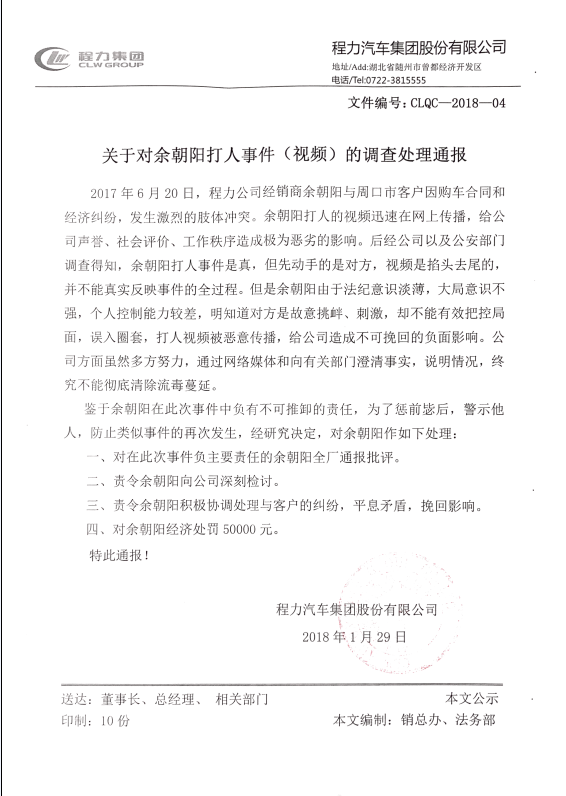 2018年1月29日,湖北程力汽車集團股份有限公司對2017年6月20日,關于對余朝陽打人事件(視頻)的調查處理做出了通報。
