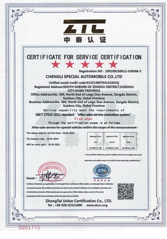 近日,程力汽車集團股份有限公司全面加強產品質量和售后服務管理工作,為企業高質增長提供可靠保障,集團公司旗下核心企業----程力專用汽車股份有限公司,經過申報、考核、驗廠,專家調研評審等嚴格評審程序,取得了國家級五星服務認證認可。
