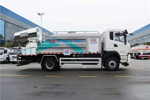 底盤電池提供動力,永磁同步電機驅動,可根據需要實時調速,取力操作與底盤行駛系統無任何關聯,用車體驗感極佳。碳鋼箱體帶防腐防銹、低水位報警系統。倒車及高炮狀態室內監控系統,40/50(10方以上60/90或50/110)威龍離心式低壓水泵,前沖、后灑、不銹鋼電子高炮均為自動控制。鋁合金后平臺、側防護。后平臺30--60米(10方以上80-100米)霧炮機組,機組電機為永磁同步電機。