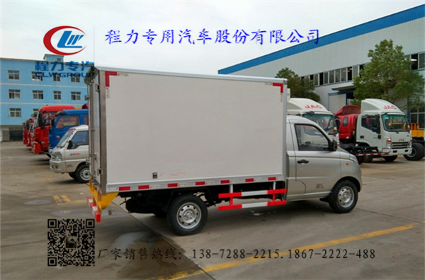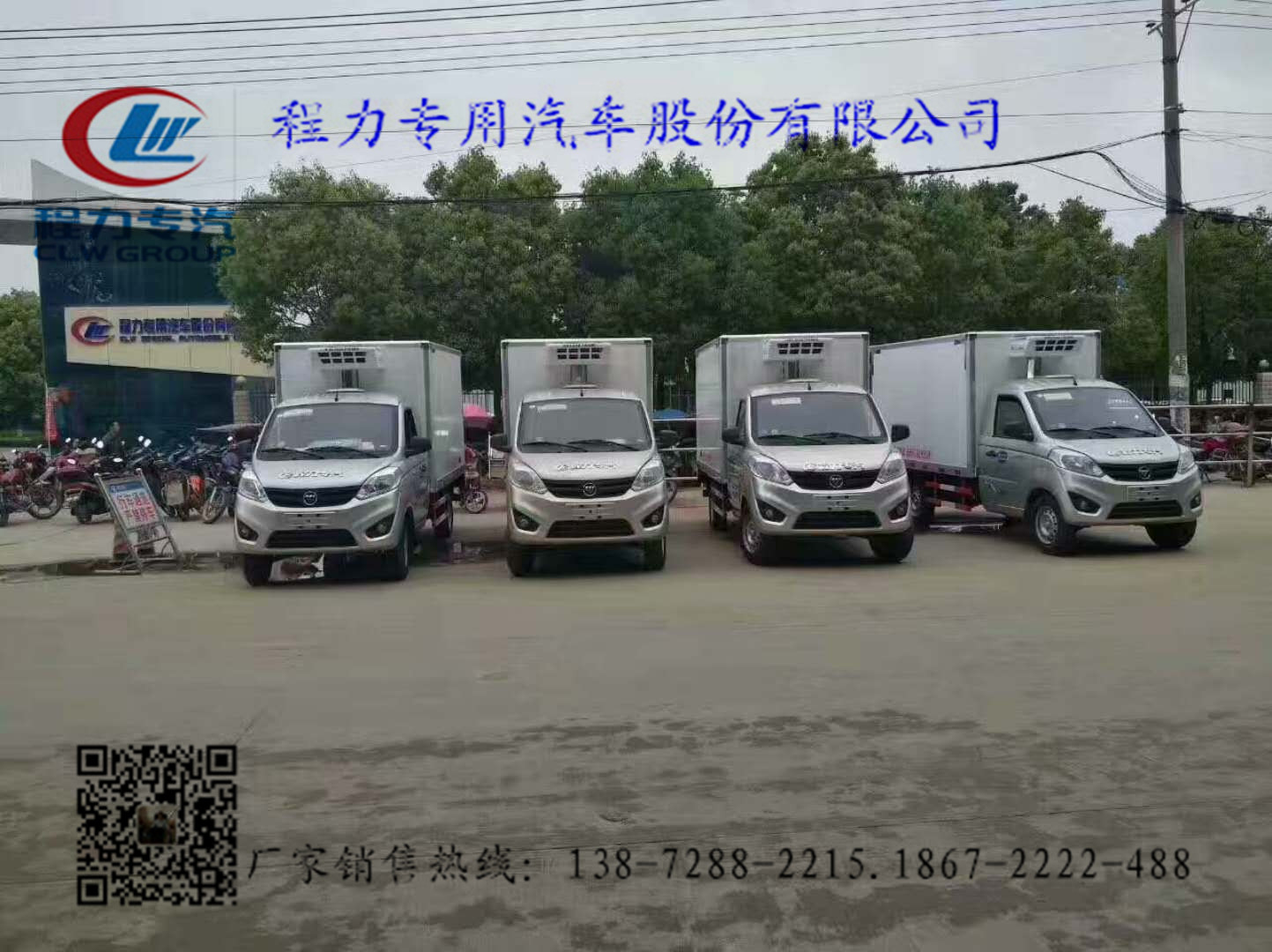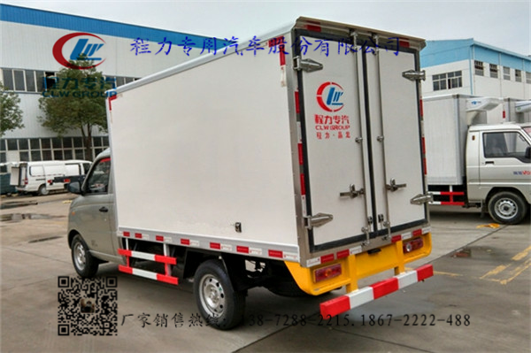 2.上裝配置:冷藏廂體內部有效尺寸:長2.795米×寬1.545米×高1.535米,廂體蒙皮采用內外玻璃鋼,隨客戶選擇內置槽鋼焊接骨架或者玻璃纖維超輕高強度骨架,填充8cm聚氨酯保溫層,不銹鋼包角,不銹鋼門框,不銹鋼門鎖件,防滑花紋鋁底板,配后雙開門,車廂右側可以選開側門,-5~-18度制冷機組。選裝導風槽,備用電源.