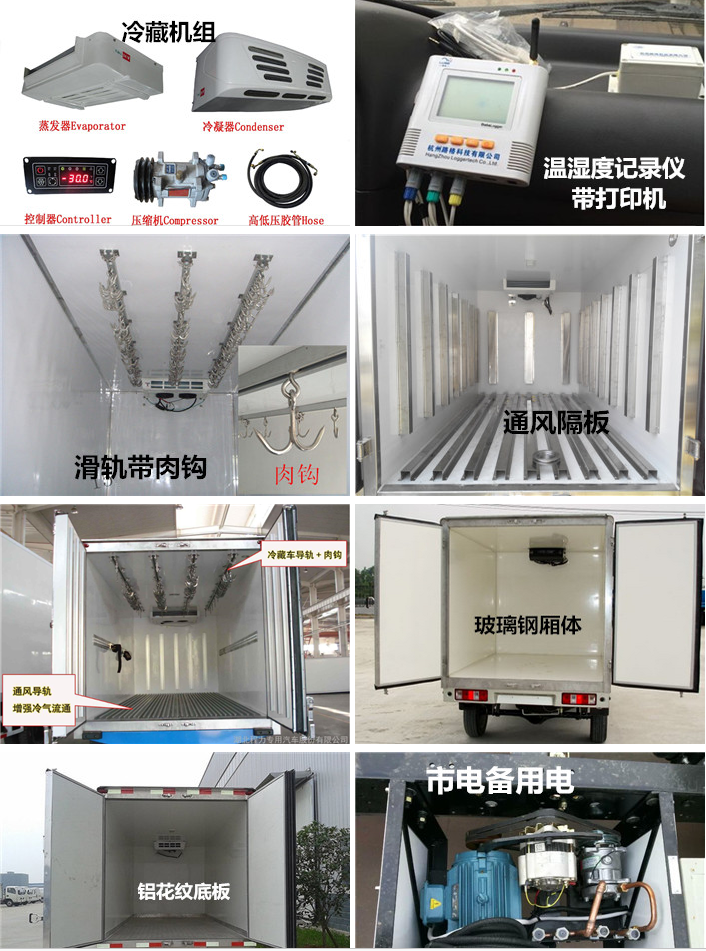 廂板材質:內外壁板選用國內優質的機制2.2mm玻璃鋼;中間保溫材料選用厚進口聚氨酯; 廂體厚度80mm 門厚度80mm;底板上面整體鋁花紋板,下面彩鋼板,中間進口聚氨酯;