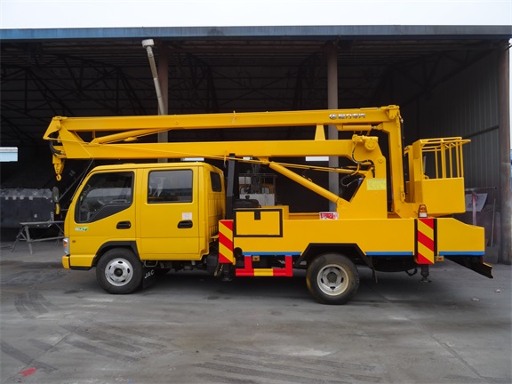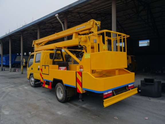 湖北程力威牌CLW5060JGKH5型高空作業車(12-16米) 【整車技術參數】 | 產品商標 | 程力威牌 | 公告批次 | 295 | 產品名稱 | 高空作業車 | 產品型號 | CLW5060JGKH5 | 總質量(Kg) | 5925 | 罐體容積(m3) | | 額定載質量(Kg) | | 外形尺寸(mm) | 7300×1980×3100 | 整備質量(Kg) | 5600 | 貨廂尺寸(mm) | ×× | 額定載客(人) | | 準拖掛車總質量(Kg) | | 駕駛室準乘人數(人) | 2+3 | 鞍座最大載質量(Kg) | | 接近角/離去角(°) | 24/12 | 前懸/后懸(mm) | 1085/2025 | 軸荷(Kg) | 2455/3470 | 最高車速(Km/h) | 110 | 備注 | 該車吊臂前伸為830mm,作業高度為14米和16米。上裝選裝二節工作臂時,作業高度為12米。防護材料:Q235A碳鋼,連接方式:左右側面及后下部防護均采用焊接連接,后下部防護斷面尺寸(mm):180×50,后下部防護離地高度(mm):420。ABS廠家及型號: 廣州科密汽車電子控制技術股份有限公司CM4XL-4S/4M。文字噴圖位置和車輛顏色可變化。僅選用7.00R16LT 14PR,7.00-16LT 14PR規格的輪胎. | 【底盤技術參數】 | 底盤型號 | HFC1073R93K2C3ZV | 底盤名稱 | 載貨汽車底盤 | 商標名稱 | 江淮牌 | 生產企業 | 安徽江淮汽車股份有限公司 | 軸數 | 2 | 輪胎數 | 6 | 軸距 (mm) | 3360 | 輪胎規格 | 7.00R16,7.00-16 | 鋼板彈簧片數 | 7/4+67/4+6 | 前輪距(mm) | 1440 | 燃料種類 | 柴油 | 后輪距(mm) | 1425 | 排放依據標準 | GB17691-2005國Ⅴ,GB3847-2005 | 發動機型號 | 發動機生產企業 | 排量(ml) | 功率(Kw) | D25TCIE1 | 昆明云內動力股份有限公司 | 2499 | 105 |